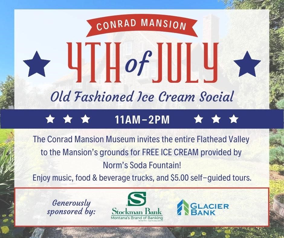 Come and enjoy a taste of old-fashioned Americana at Conrad Mansion Museum! The event is open to the entire community and will feature FREE ice cream provided by Norm's Soda Fountain. Following the Kalispell parade, you can bring your friends and family to the Conrad Mansion’s grounds to enjoy music, ice cream, barbecue, soda, and $5.00 self-guided tours of the Conrad Mansion.
