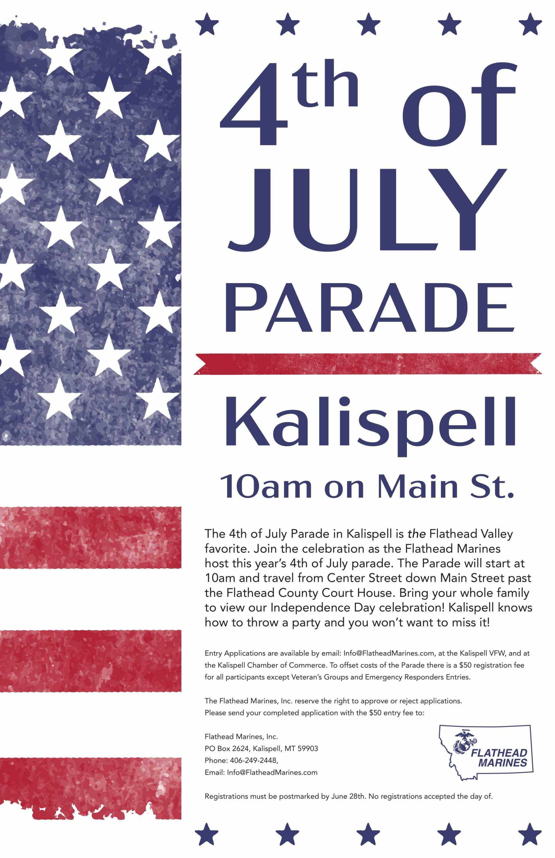 Please review the Parade Entry application and mail just the signed and completed last page and $50 entry fee to Flathead Marines at PO Box 2624, Kalispell, MT 59903