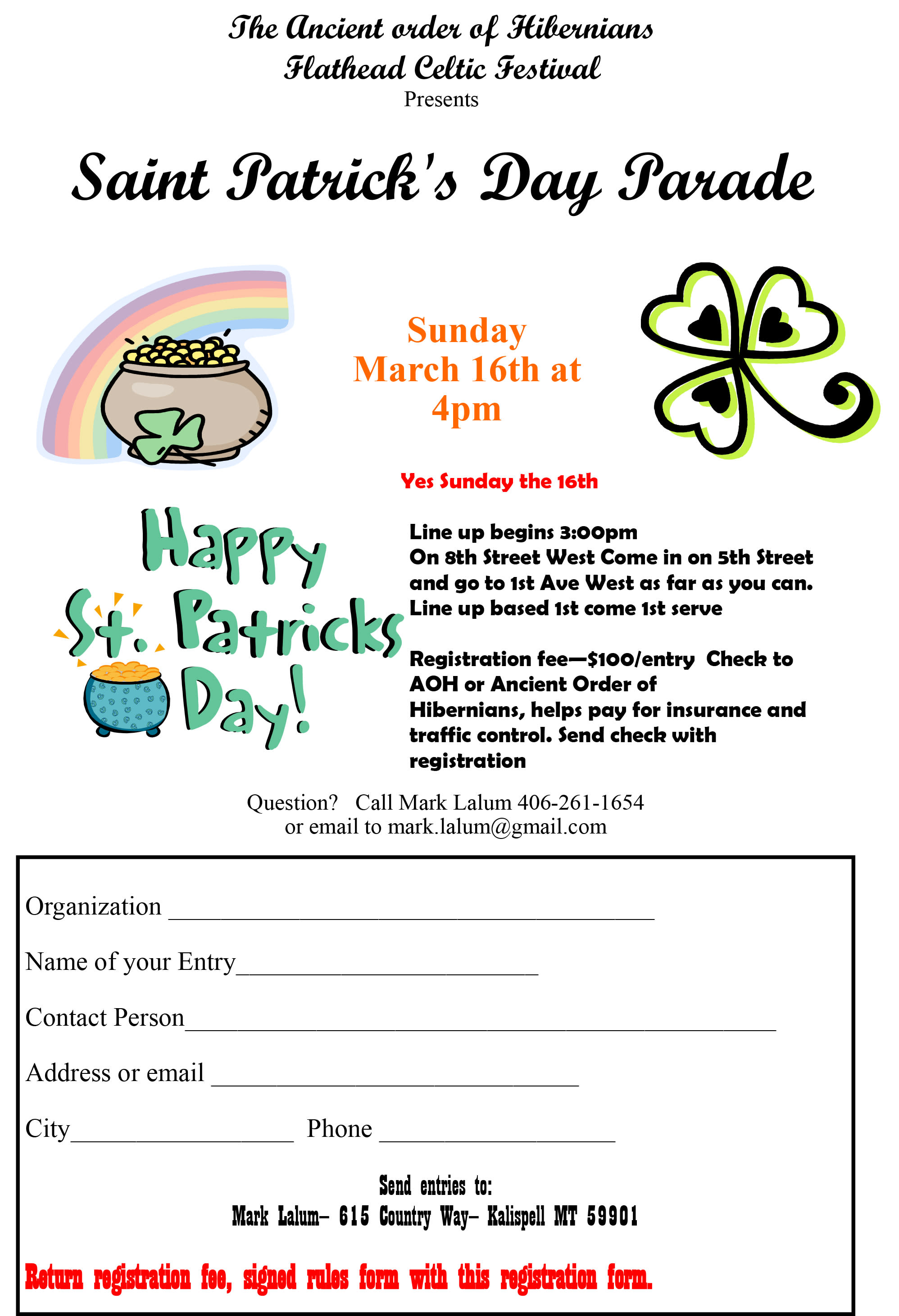 The Kalispell Chapter of the Ancient Order of Hibernians and the Flathead Celtic Festival is back and ready to spread Irish cheer again by hosting the St. Patrick's Day parade on Sunday, March 16th, Main Street Kalispell at 4pm.