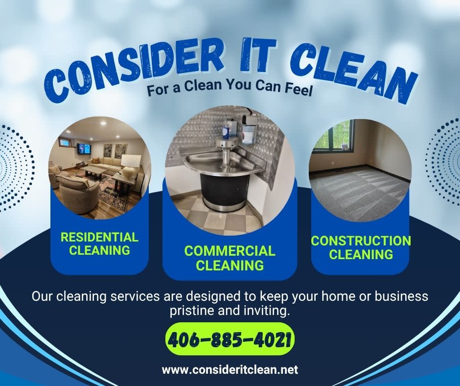 Consider it Clean! is a locally owned and community-focused residential and commercial cleaning company dedicated to delivering dependable, high-quality service with a personal touch. We specialize in a wide range of cleaning solutions, including recurring home maintenance, deep cleans, move-in/move-out services, vacation rental turnover, new construction cleans, and commercial property care.